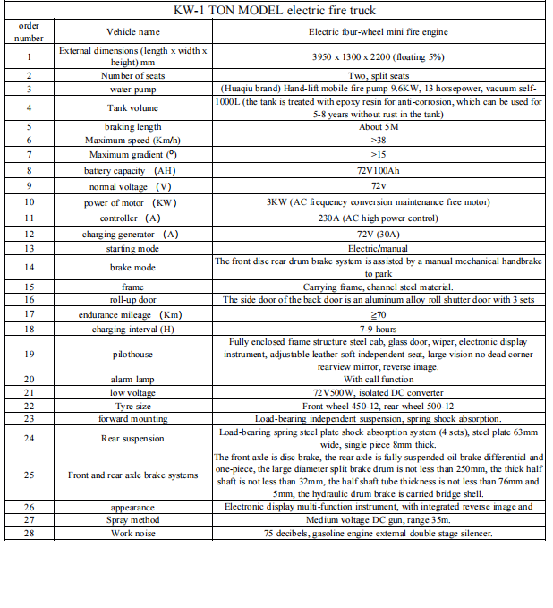 Kw-1 ton eredua suhiltzaile elektrikoaren kamioiaSuteak babesteko sistema tradizionalaren osagarri garrantzitsua da, batez ere hasierako suteen aurkako borrokan, ingurune estuetarako eta eguneroko prebentziorako egokia. Ingurumena errespetatzen da, ekonomikoa eta praktikoa, eta egokiak dira komunitateetan, paraje eszenikoetan, parke industrialetan eta beste agertokietan sustatzeko.
